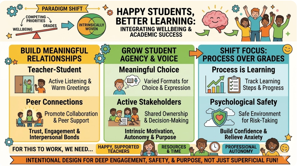 In summary, fostering happiness requires moving beyond superficial fun and intentionally designing learning experiences and environments that cultivate autonomy, relational trust, and a genuine sense of purpose.